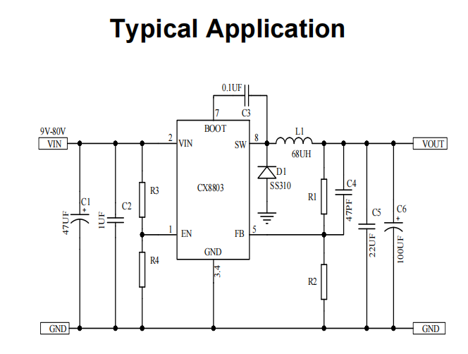 CX8803 is a high voltage asynchronous buck converter with input voltages ranging from 9V to 80V.