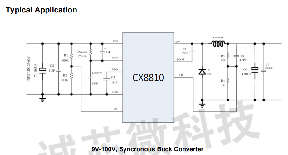 CX8810 is a high voltage synchronous buck converter with an input voltage range of 9V-100V.